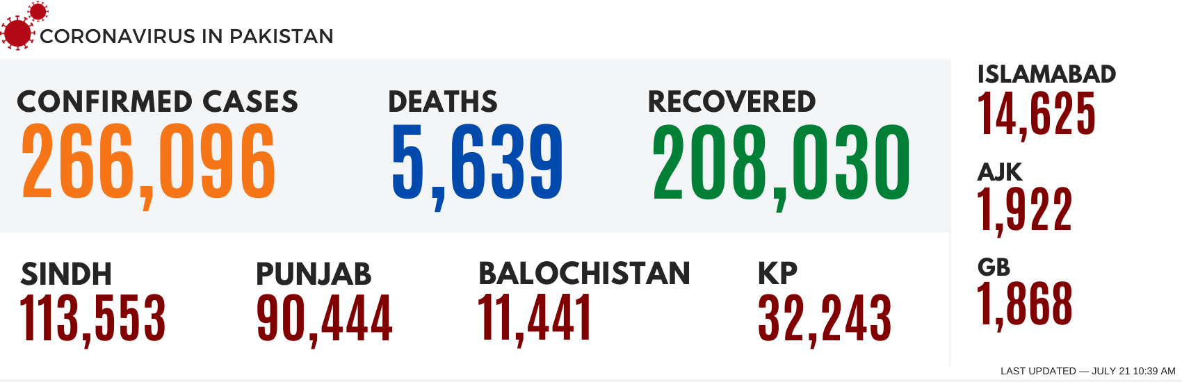 گزشتہ 24 گھنٹوں کے دوران پاکستان میں ایک ہزار 13 کورونا کیسز سامنے آئے ہیں جس کے بعد ملک میں اب تک 2 لاکھ 66 ہزار 96 افراد میں کورونا کی تشخیص ہوئی ہے جن میں سے 52 ہزار 427 اب بھی فعال ہیں اور 2 لاکھ 8 ہزار سے زائد مریض صحت یاب ہو چکے ہیں۔ سندھ میں کورونا مریضوں کی تعداد ایک لاکھ 13 ہزار 553 ، پنجاب میں 90 ہزار 444، خیبرپختونخوا میں 32 مہزار 243، بلوچستان میں 11 ہزار 441 ، اسلام آباد میں 14 ہزار 625 ، آزاد جموں و کشمیر میں ایک ہزار 922 اور گلگت بلتستان میں ایک ہزار 868 کورونا مریض ہیں۔سرکاری اعداد و شمار کے مطابق گزشتہ 24 گھنٹوں کے دوران ملک بھر میں کورونا کا شکار مزید 40 افراد لقمہ اجل بن گئے ہیں، اس طرح ملک بھر میں اس وبا سے جاں بحق ہونے والوں کی تعداد 5 ہزار 639 ہوگئی ہے۔ پنجاب میں 2 ہزار 90، سندھ میں 2 ہزار 19، خیبر پختونخوا میں ایک ہزار 147، اسلام آباد میں 160، بلوچستان میں 133، آزاد کشمیر میں 47 اور گلگت بلتستان میں 43 افراد اب تک اس وائرس میں مبتلا ہوکر جاں بحق ہوچکے ہیں۔