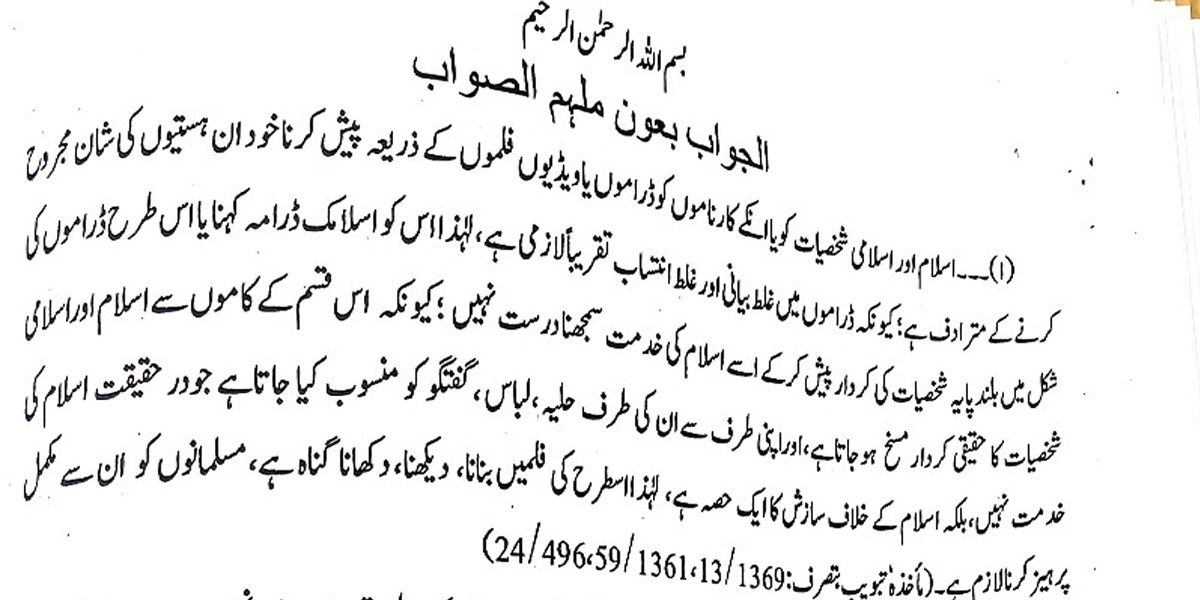 فتوے میں کہا گیا کہ ڈراموں میں اپنی طرف سے حلیہ، لباس اور گفتگو کو منسوب کیا جاتا ہے جو در حقیقت اسلام کی خدمت نہیں بلکہ اسلام کے خلاف سازش کا ایک حصہ ہے۔